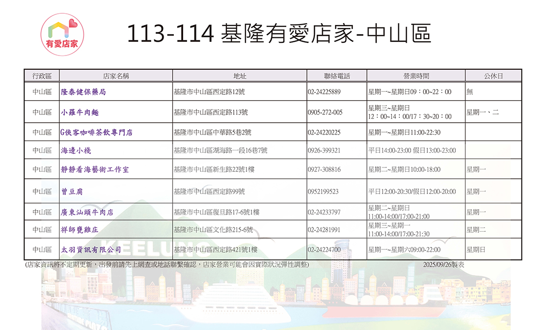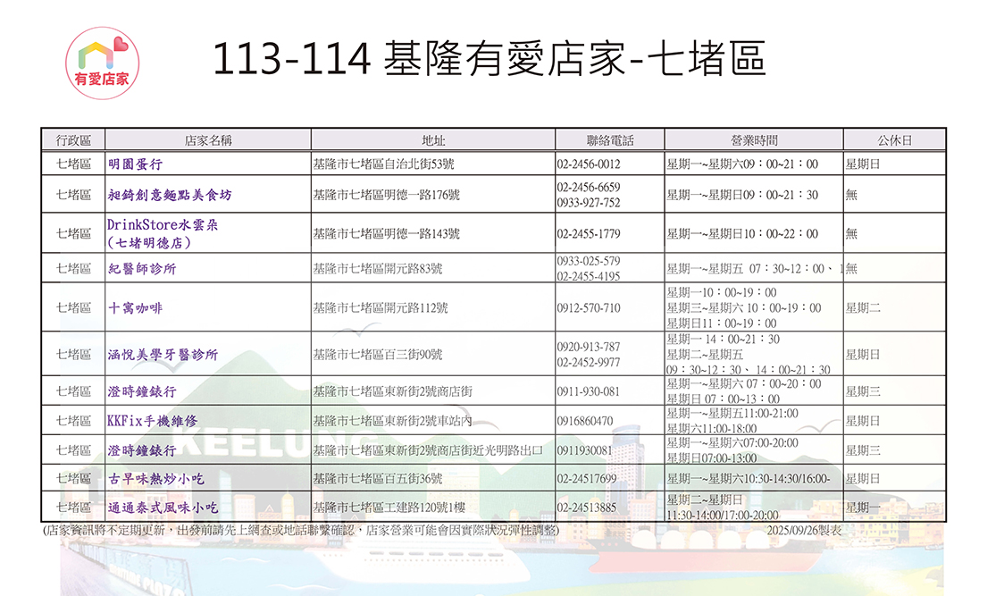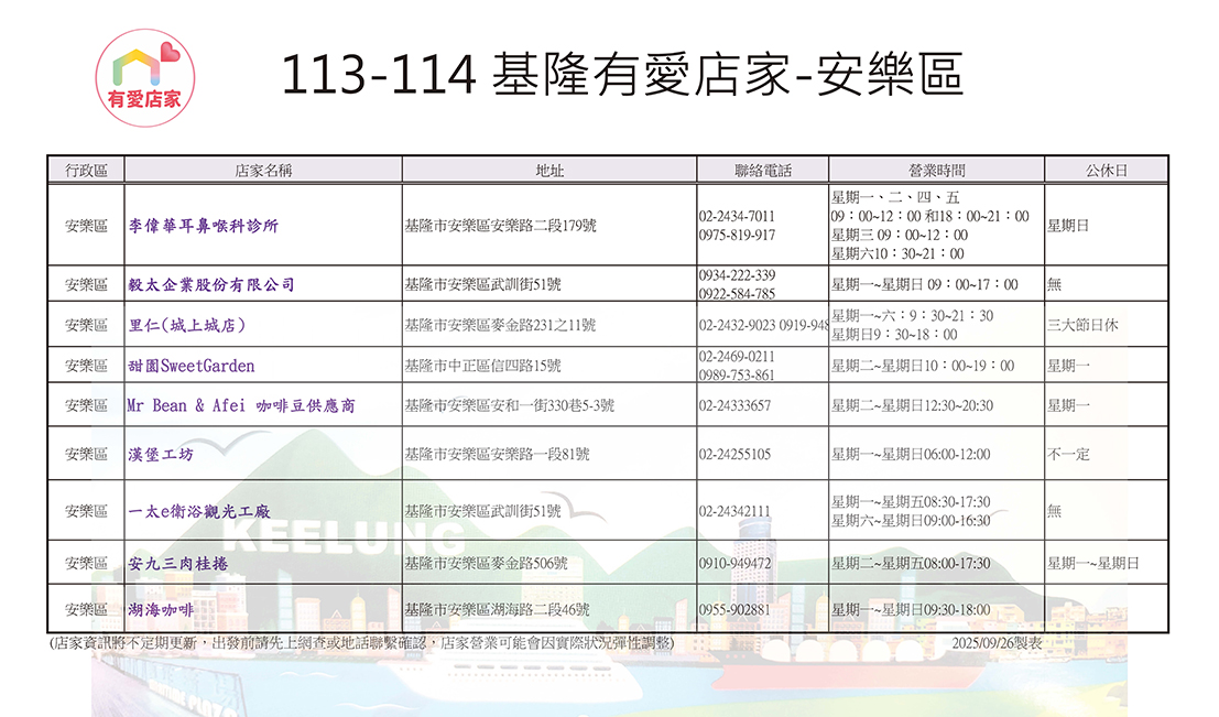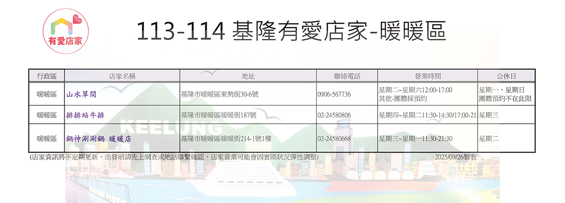 基隆市為實踐有愛城市政策願景,共同營造本市友善生活及無障礙生活環境,持續推動本計畫,鼓勵更多在地商家加入有愛店家行列,提供友善、共融的無障礙服 務與空間,讓住在基隆的家庭或來基隆旅遊的遊客,從日常生活到旅遊觀光,都能透過與有愛店家的互動,實際感受「亞洲最有愛城市」的溫暖與包容,進一步打造基隆無障礙旅遊的城市品牌形象。