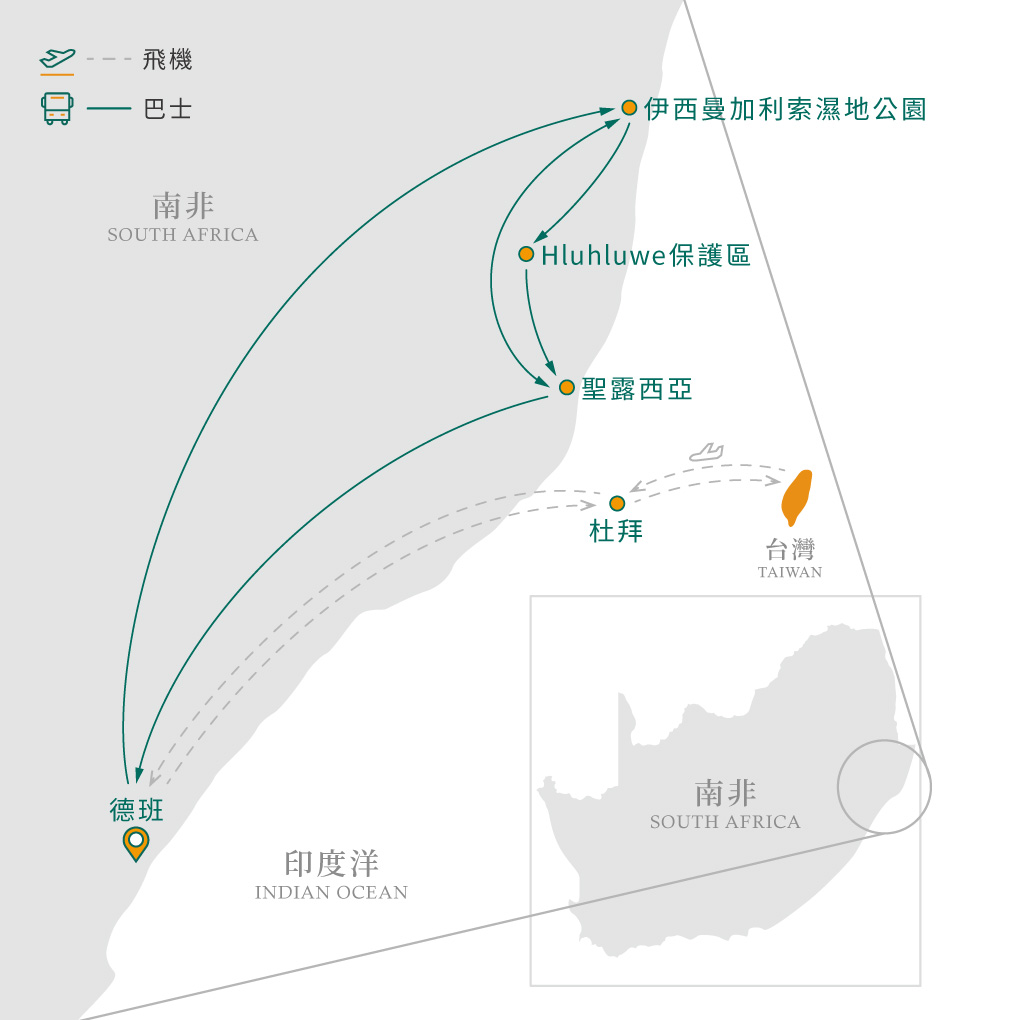 - 雙世界遺產聖境探索:南非第二大保護區 Hluhluwe-iMfolozi, 深入全球白犀牛復育聖地,領略「非洲五大獸」的野性脈動。聯合國教科文組織認定的 iSimangaliso 濕地公園遊船巡航。